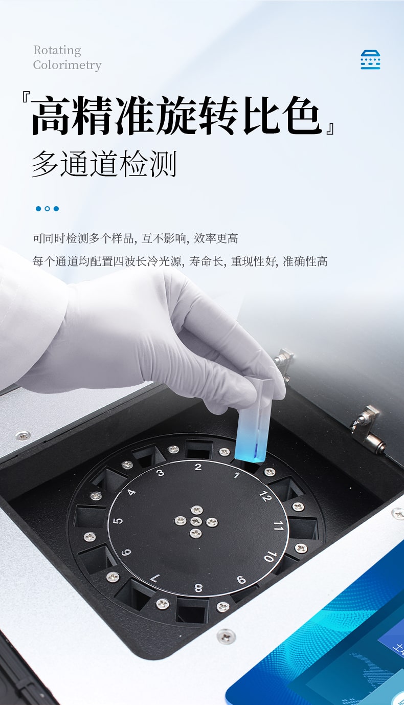 3、12個旋轉(zhuǎn)檢測通道,一次性可快速檢測12個樣品,極大提升檢測效率,降低檢測成本。