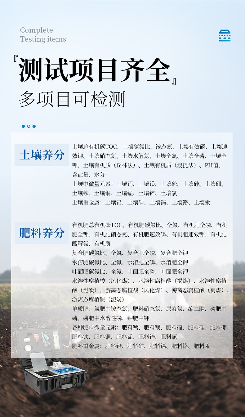 1、土壤養(yǎng)分:●土壤總有機碳TOC、土壤碳氮比、銨態(tài)氮、土壤有效磷、土壤速效鉀、土壤硝態(tài)氮、土壤水解氮、土壤全氮、土壤全磷、土壤全鉀、土壤有機質(zhì)(丘林法)、土壤有機質(zhì)(浸提法)、PH值、含鹽量、水分?!裢寥乐形⒘吭兀和寥棱}、土壤鎂、土壤硫、土壤硅、土壤硼、土壤鐵、土壤銅、土壤錳、土壤鋅、土壤氯;●土壤重金屬:土壤鉛、土壤砷、土壤鎘、土壤鉻、土壤汞。
